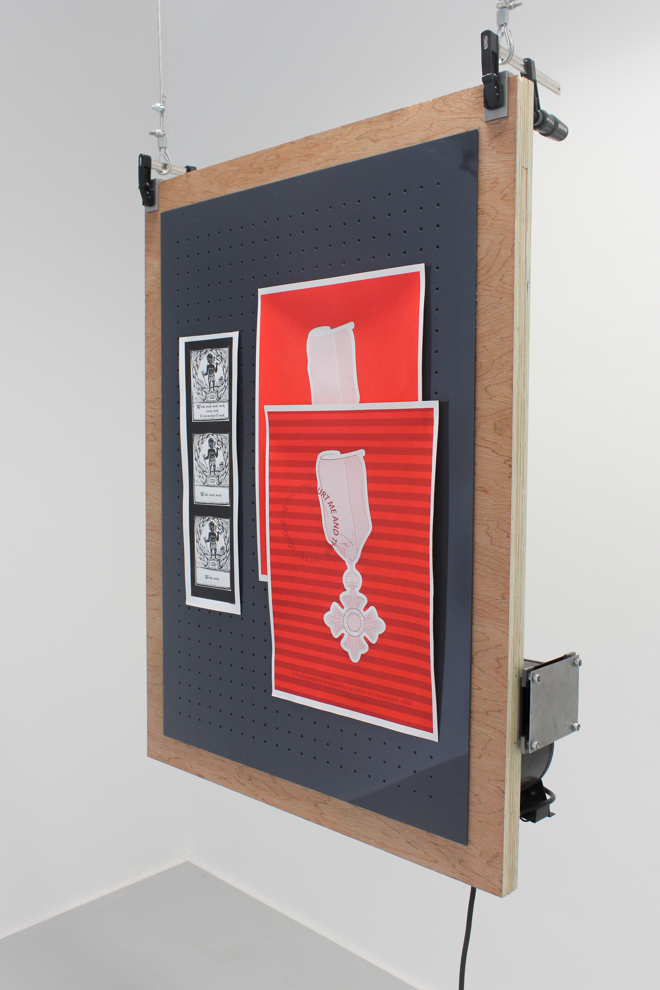 (Plywood, acrylic, steel rope, f-clamps, centrifugal fan, and screen prints)
